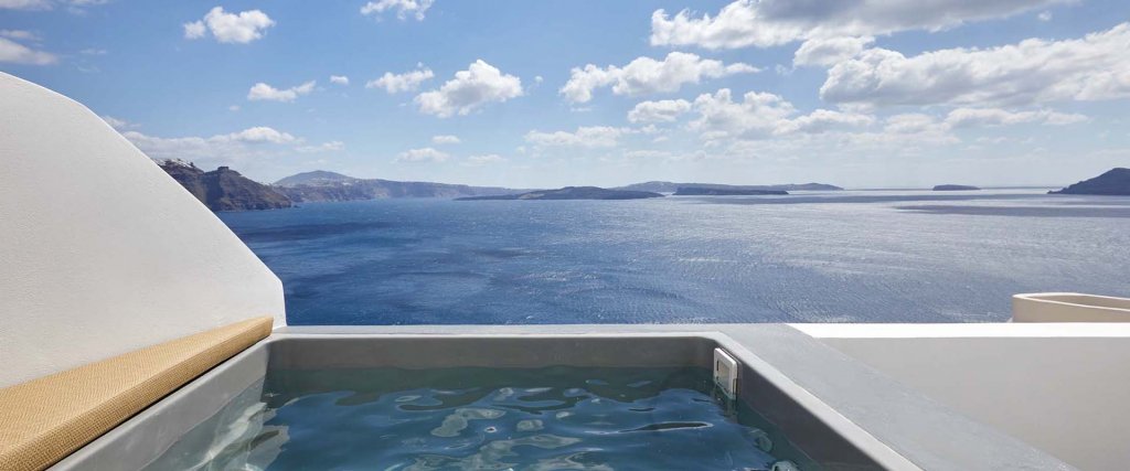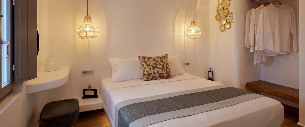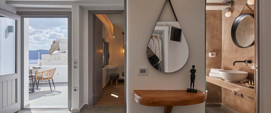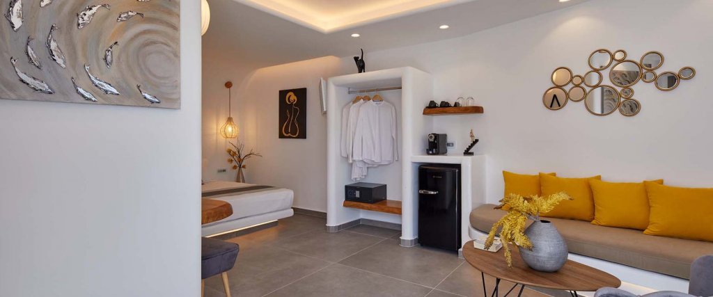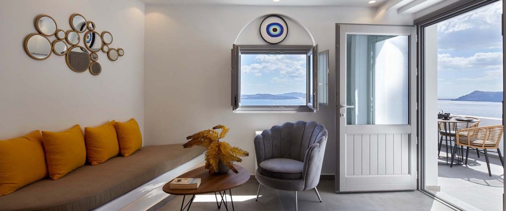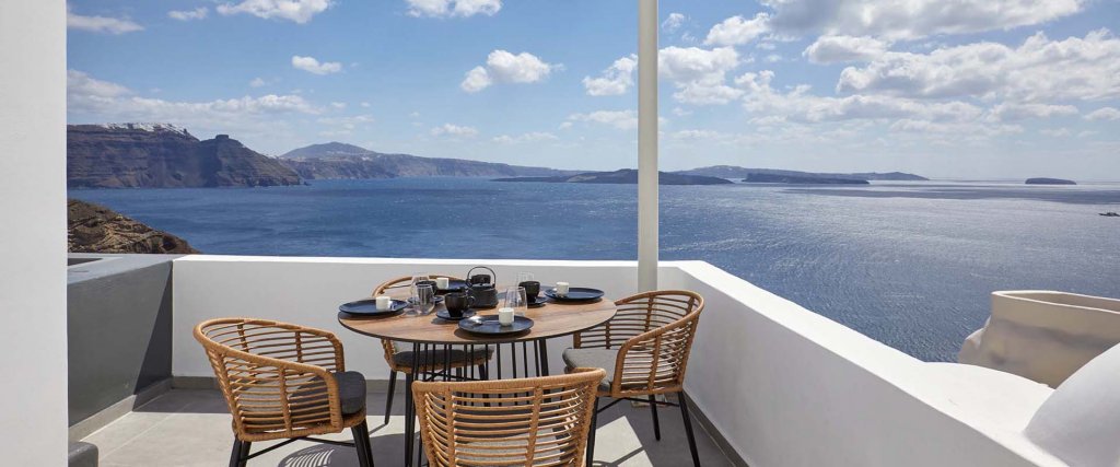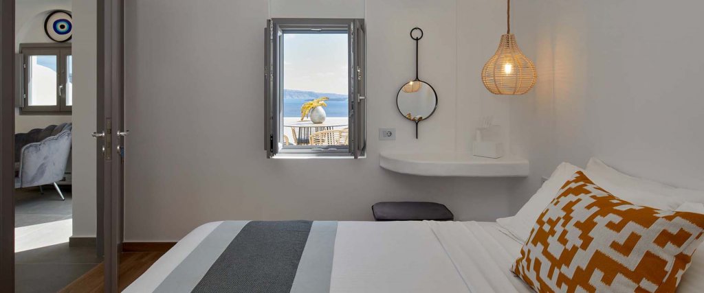Accommodating up to four guests, the Family Suite offers an open space in traditional Cycladic style, fit with a double bed, a lounge area, a dining table, and a fully equipped kitchenette. A second double bed is found in a separate bedroom, as well as a modern bathroom with a shower. This suite offers breathtaking panoramic views of the Aegean Sea, the caldera ridge, and the volcano from its private furnished balcony.